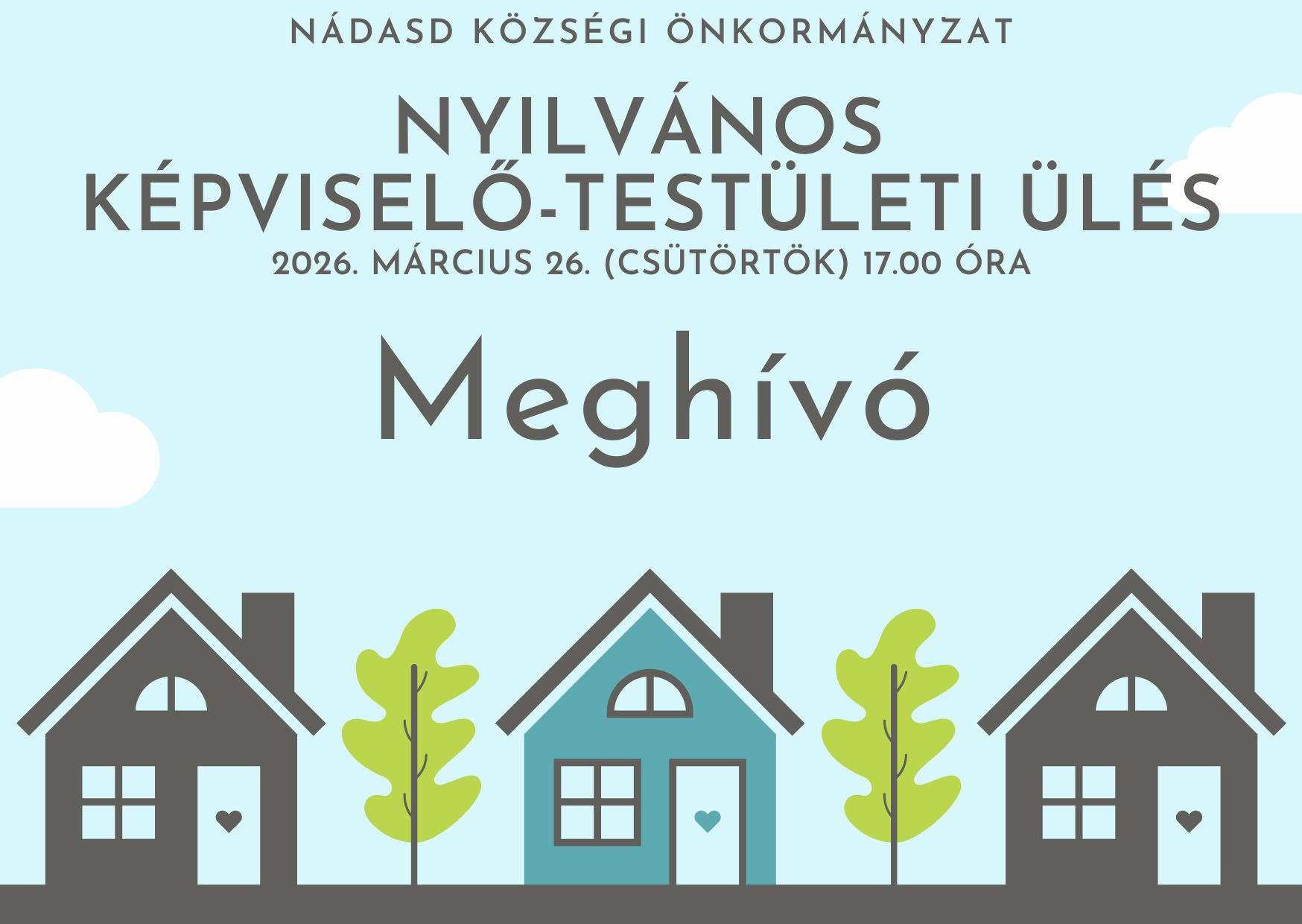 Értesítem a Tisztelt Lakosságot, hogy 2026. március 26-án (csütörtökön) 17 órakor nyilvános képviselő-testületi ülést tartunk.