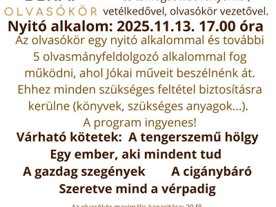 Az olvasókör egy nyitó alkalommal és további 5 olvasmányfeldolgozó alkalommal fog működni, ahol Jókai műveit beszélnénk át. Ehhez minden szükséges feltétel biztosításra kerülne (könyvek, szükséges anyagok...). A program ingyenes!